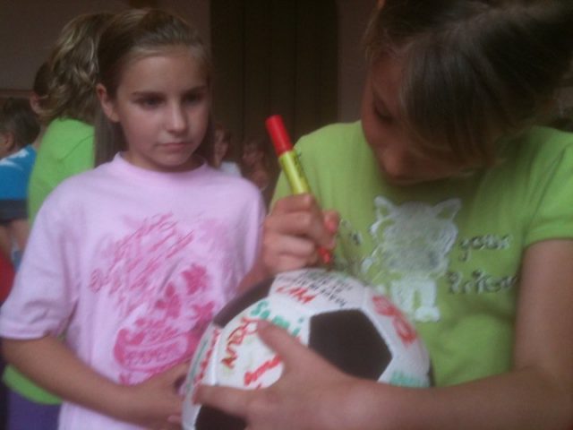 3rd and 4th grade kids at the Reyer School One Ball: One World workshop today line-up to sign a replica of The Ball 2010… also made my Alive and Kicking in Kenya