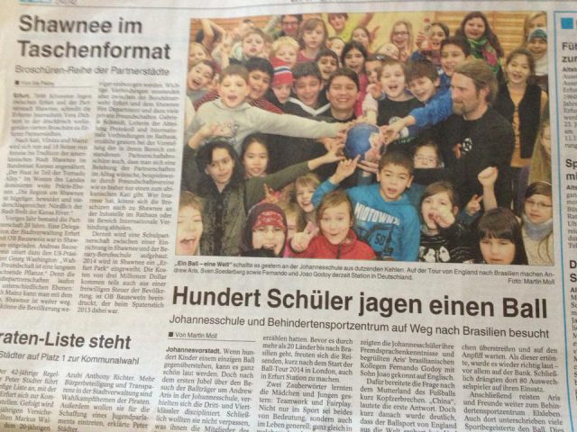 ” The Ball 2014″ von Spirit Od Football war heute zu Gast im Landessportzentrum Elxleben . Nach einer gemeinsamen Trainingseinheit mit den Rolli – Kids und dem Oettinger RSB Team Thüringen, wurde der Ball signiert und geht nun weiter auf seiner Reise nach Brasilien zur Fußball WM .