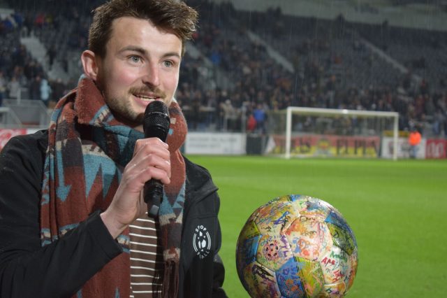 Benni Linse is quite nervous. He gives an interview about Spirit of Football and the Ball Journey. Martin and I accompany him. I film this exciting moment and Martin takes pictures.