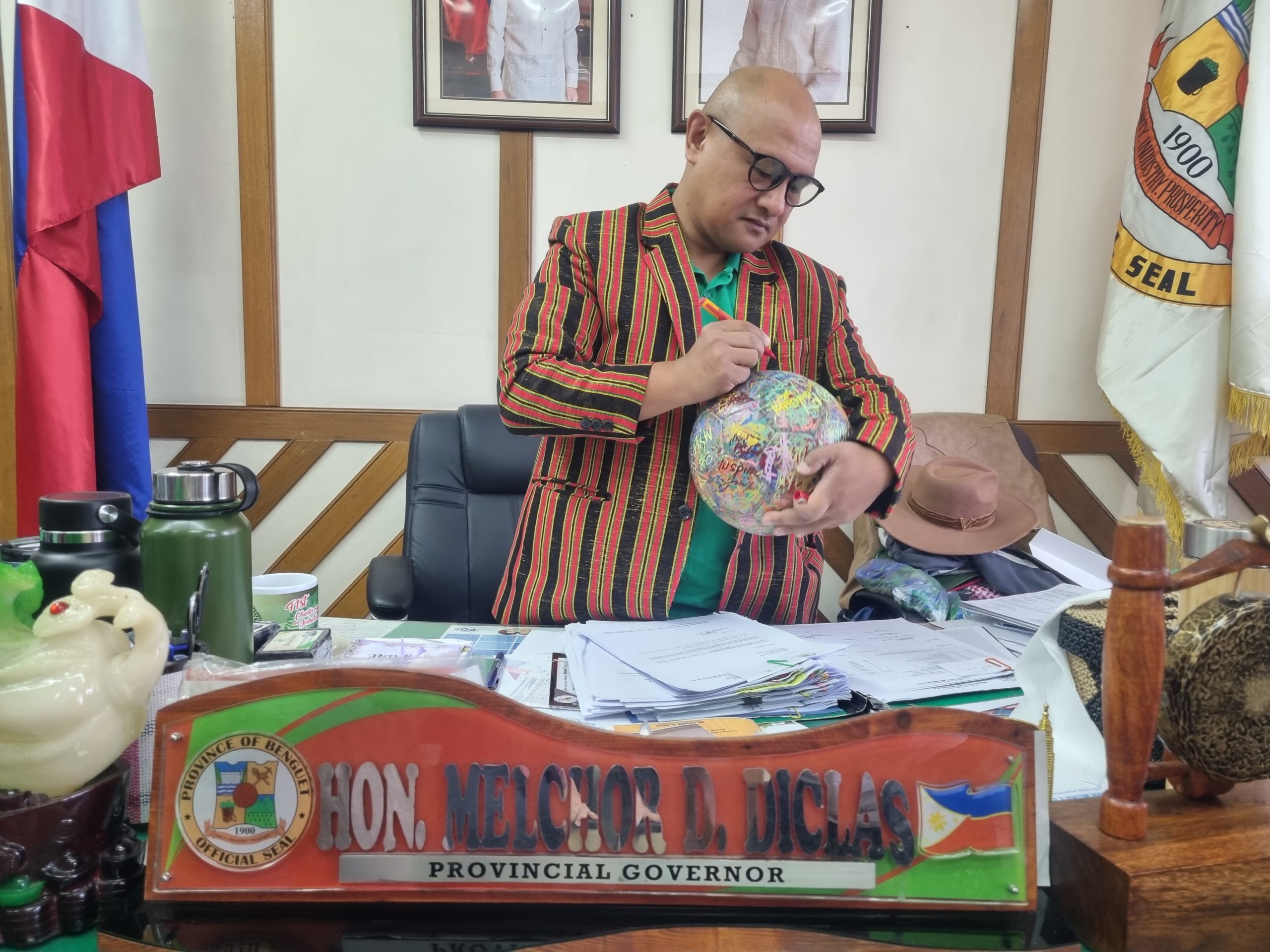 And so it was that The Ball and its Ambassadors along with Dexter See, President of the Baguio Football Club, went on a quick fire meet and greet with local indigenous dignitaries: Melchor D. Diclas, M.D., Governor of the Province of Benguet signed The Ball in his office in the state capital and pledged to plant trees and maintain renewable energy. Next up was Roderick Chiok Awingan, Vice Mayor of the Municipality of La Trinidad, who pledged the following: